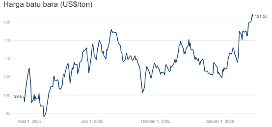 据CNBC 印度尼西亚频道2月20日报道的消息,其援引路孚特(Refinitiv)的数据显示, 周四(2月19日)交易日,全球动力煤基准洲际交易所(ICE)纽卡斯尔煤炭期货合约交易价格收于每吨121.55美元,环比前一交易日下降0.49%。这一下降打破了煤炭价格连续上涨的趋势,之前五个交易日价格持续上涨了5.1%,实现了了预期的每吨120美元关口的突破,2月18日的最高价格水平达到122.15美元/吨。