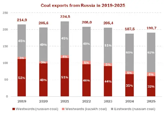 这种下降是在煤炭铁路物流领域业已完成的突发的结构性转变背景下发生的。2022年铁路运往西方和东方的出口煤炭还相对均衡,分别占51%和49%。但到2025年,却已然形成了明显的不平衡,向东运输量达1.184亿吨,几乎是向西运输量的两倍。东方方向出口煤炭运输量在总量中的占比达到创纪录的62%,牢固确立了其绝对的主导地位。
