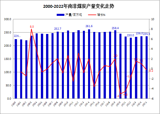2025年南非煤炭产量2.355亿吨,同比微降0.2%