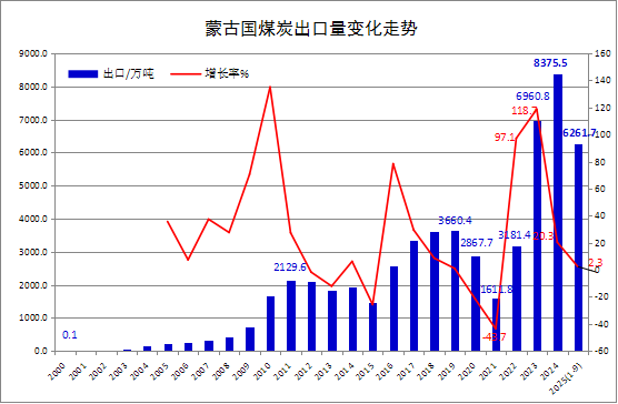9月份,蒙古国煤炭出口量出现大幅增长,当月出口量为903.4万吨,同比增加66.7%,环比增长13.7%。其中,硬煤出口903.48万吨,同比增加66.3%,环比增长12.8%;褐煤出口65.15万吨,同比增加71.5%,环比增长28.5%。