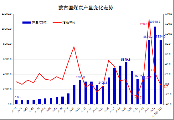 其中,11月份蒙古国煤炭产量大幅增长,当月煤炭产量为1063.54万吨,同比增加23.1%,环比增长17.0%。