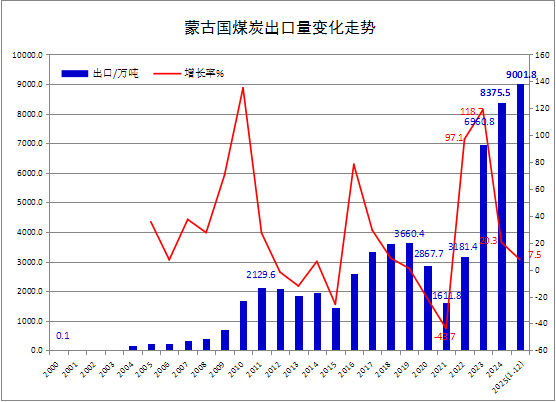 据蒙古国海关机构(Mongolian Customs Service)发布的统计数据显示,2025年1-12月,蒙古国煤炭出口量累计达到9001.82万吨,首次突破9000万吨关口,创出历史新纪录,比上年同期增加626.3万吨,同比增长7.5%。