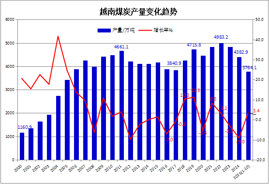 据越南财政部国家统计局(NATIONAL STATISTICS OFFICE-NSO)发布的主要工业产品产量初步统计快报数据显示,2025年1-10月,越南煤炭产量预计为3764.1万吨,比上年同期增长3.4%。