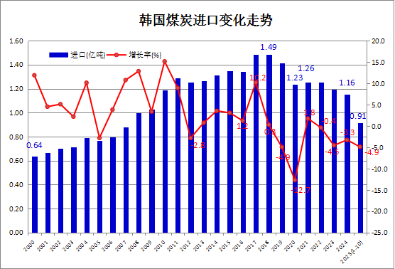 据韩国海关(Korea Customs Service -KCS)发布的统计数据显示,2025年1-10月,韩国煤炭进口量累计为9140.6万吨,比上年同期下降4.9%。
