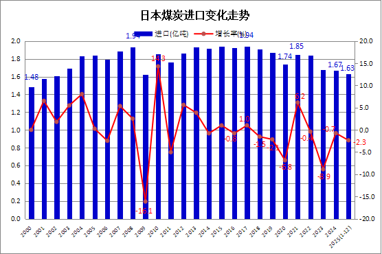 据日本财务省(Ministry of Finance Japan)发布的海关商品进出口贸易统计数据显示,2025年1-12月,日本煤炭进口量累计为1.63亿吨,较上年同期的1.67亿吨下降2.3%。其中,12月份煤炭进口量为1470.27万吨,同比下降7.7%,环比增长13.0%。