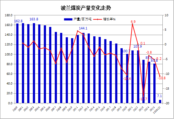2026年1月波兰煤炭产量同比下降10.8%,环比增长6.4%