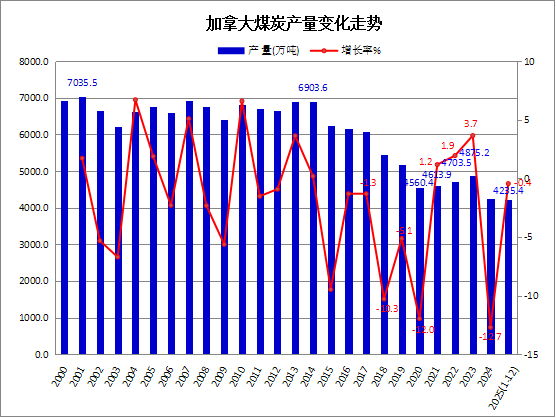 据加拿大统计局(Statistics Canada)发布的统计数据,2025年1-12月份,加拿大煤炭产量累计为4235.4万吨,与上年同期产量基本持平,微降0.4%,比上半年的降幅2.9%大为收窄。