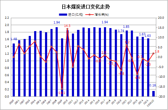 2026年1月份,日本煤炭进口量为1580.66万吨,同比增加1.8%,环比增长7.5%。
