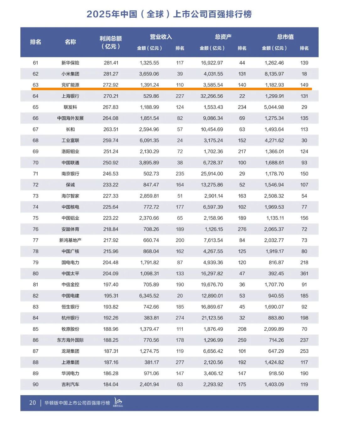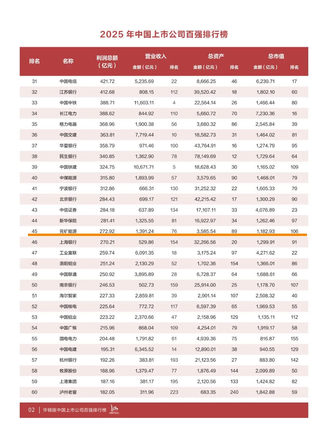 10月17日,由中国上市公司百强高峰论坛主办的“2025年中国上市公司百强排行榜” 正式发布。兖矿能源以272.92亿元利润总额荣登榜单第45位。在同步发布的“中国(全球)上市公司百强排行榜”上公司同样表现出色,排名第63位。